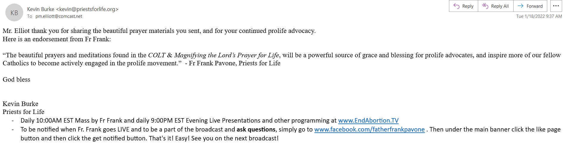 I am (or we are) writing on behalf of our family and others blessed to be members of your parish to ask you to please distribute the USCCB flyers listed in the USCCB Respect Life Month Statement (attached) and as listed in the attached program of the Diocese of Charlotte, along with the attached flyer that is being distributed in the parishes of the Archdiocese of Philadelphia (compiled by the Pennsylvania Catholic Conference). The attached “USCCB-based Nonpartisan Parish Pre-Election Catholic Education Program” outlines a suggested way to distribute these flyers, which are vitally needed by Catholics to apply the guidance of the U.S.C.C.B. guide, Forming Consciences for Faithful Citizenship, in making voting decisions. The flyers (attached to this email) and a suggested timing of distribution are as follows: